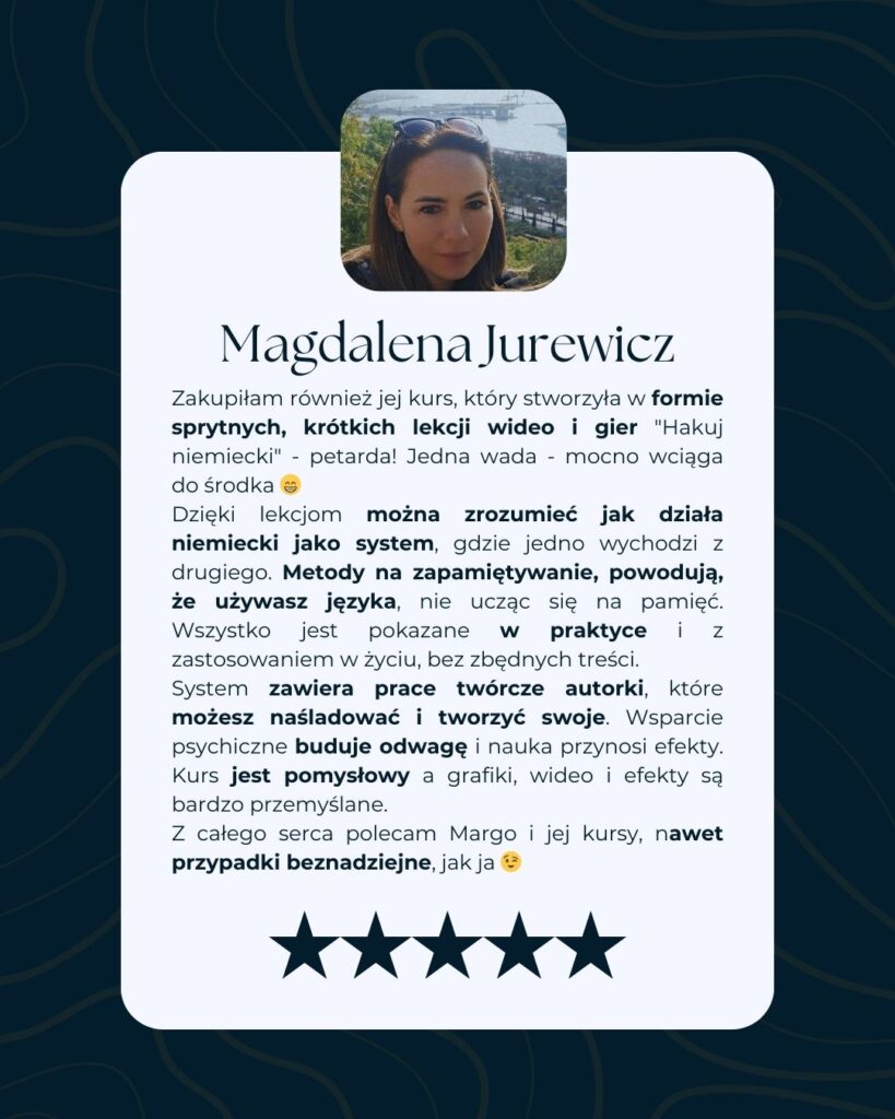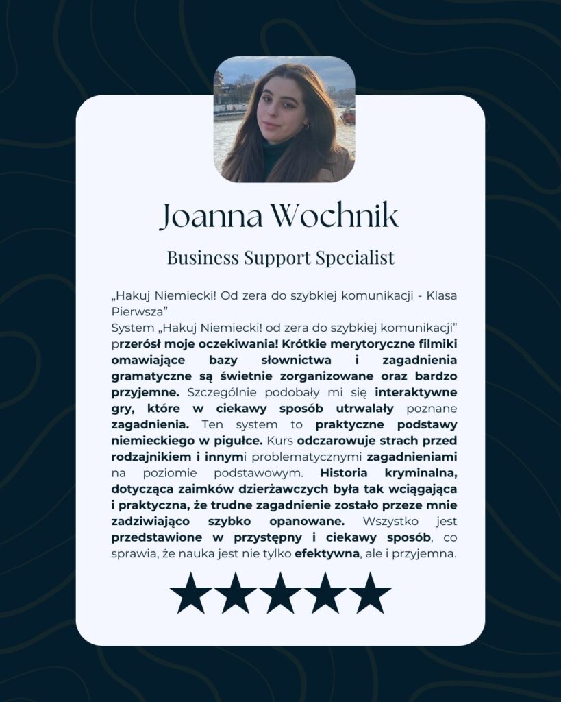 „Hakuj Niemiecki” to autorski system, który w 90 dni przeprowadzi Cię od niepewności do płynnej, profesjonalnej komunikacji na poziomie B1/B2. Bez wkuwania, bez nudy, bez wstydu.