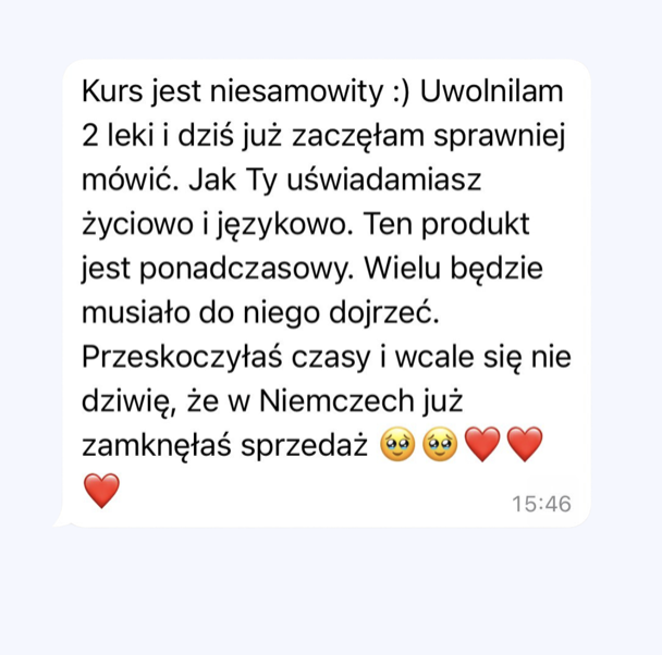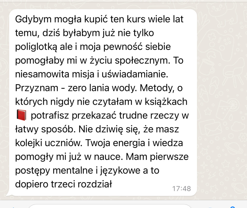 • 10 modułów, 34 lekcje: Solidna podstawa zawarta w Pakiecie Ekonomicznym oraz dwie dodatkowe lekcje – Sekret radykalnej siły ducha + Pokaż mi wyniki, a powiem Ci, kim jesteś, które pomogą Ci odkryć rozbudowane strategie przyspieszące rozwój językowy i głębokie techniki mentalne. Proces nauki języka opisany od zera ku biegłości na przykładzie wybranego języka. Uczę Cię go i wzoru na naukę innych języków w sposób rozbudowany i poparty dowodami. Wzór nauki krok po kroku. Przykłady zadań, konspekty lekcji, metody hakowania nauki języka, by zminimalizować proces nauki Wartość: bezcenne